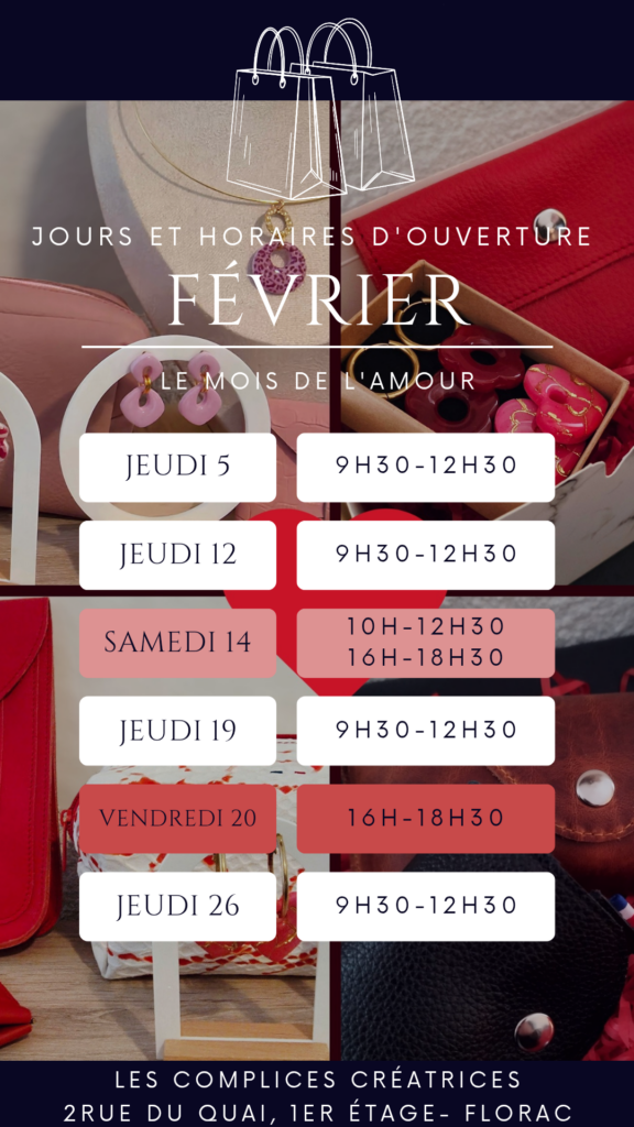 Nous avons le plaisir de vous partager notre planning d’ouverture pour ce mois de février placé sous le signe de l’amour :