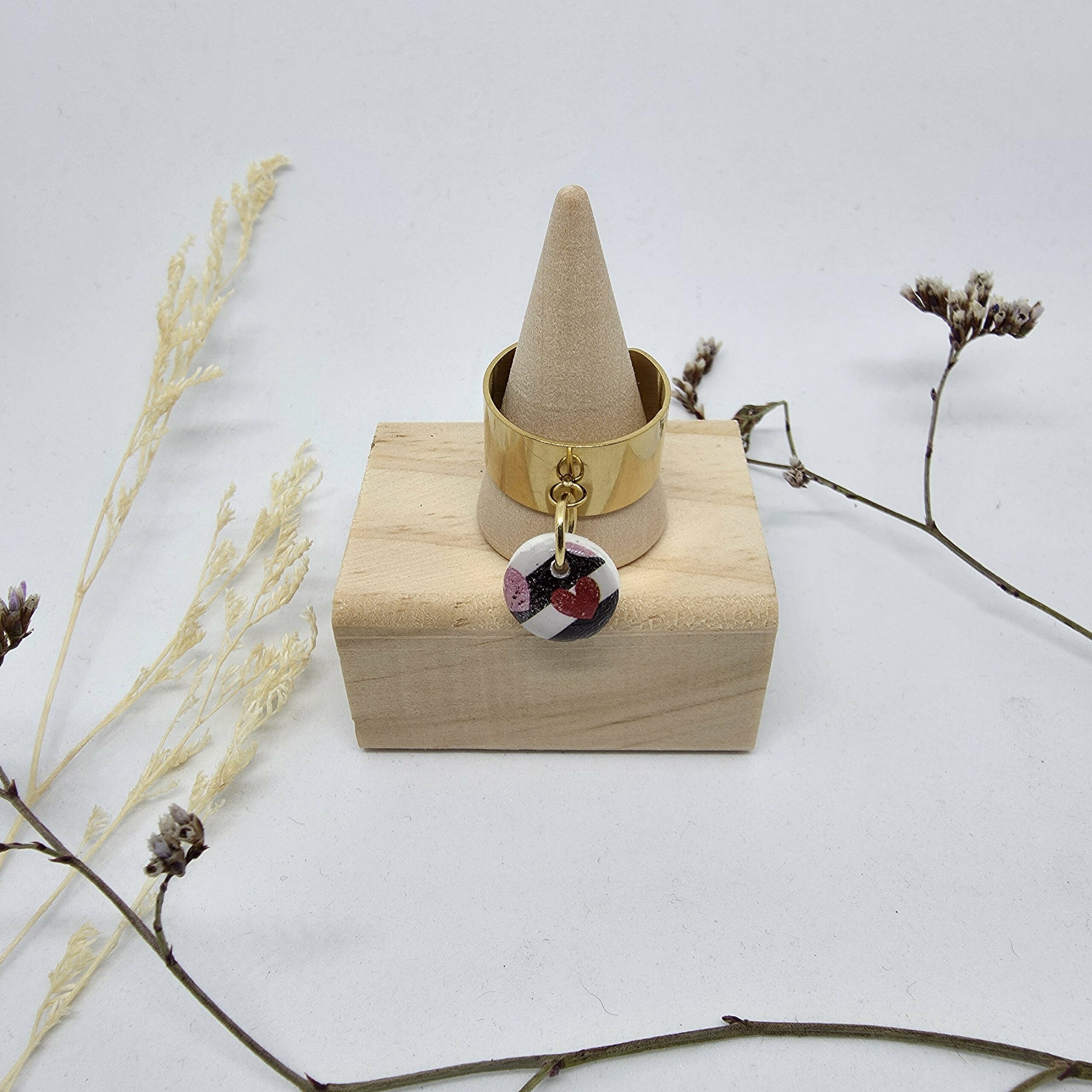 La bague manchette présente une base large et épurée de couleur or. Son atout charme est son médaillon rond, confectionné à la main en pâte polymère. Le motif est un mélange graphique et affectueux de noir, de blanc, et de cœurs rouges et roses, ajoutant un contraste joyeux et percutant au métal doré.