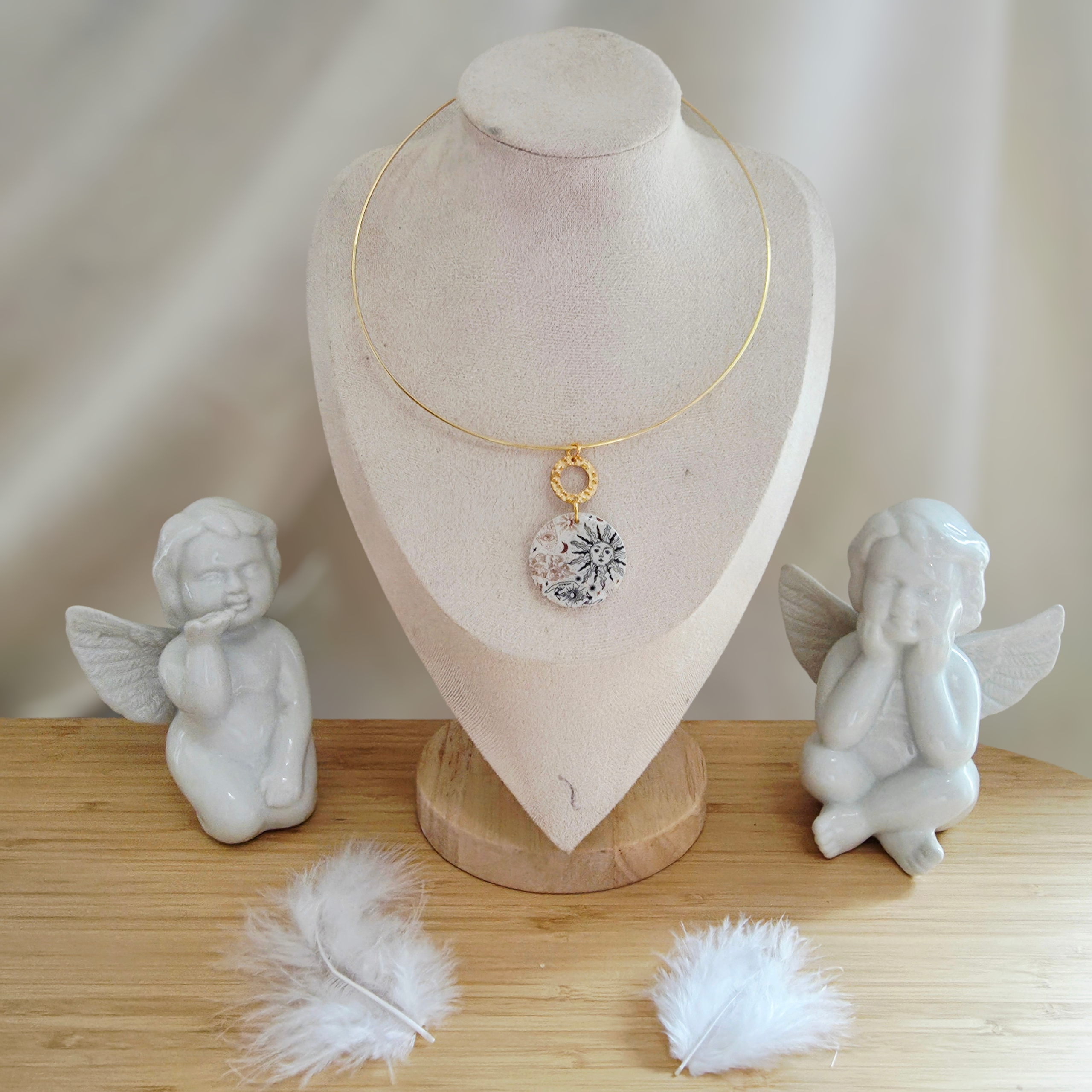 Son médaillon central en pâte polymère, véritable œuvre miniature, dévoile des illustrations célestes raffinées sur un fond blanc éclatant, créant un contraste saisissant avec la brillance du métal doré.